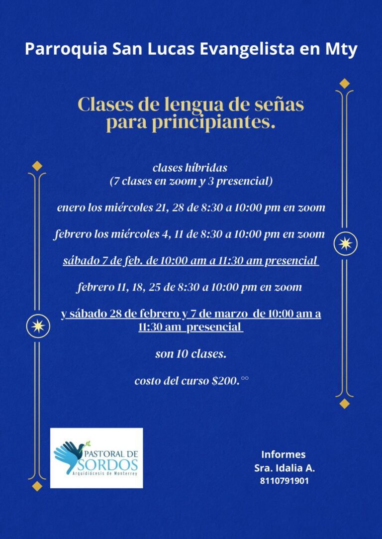 La Pastoral de Sordos de la Arquidiócesis de Monterrey, a través de la Parroquia San Lucas Evangelista, les invita cordialmente a participar en su nuevo curso de Lengua de Señas. Este curso está diseñado para principiantes y se impartirá en…